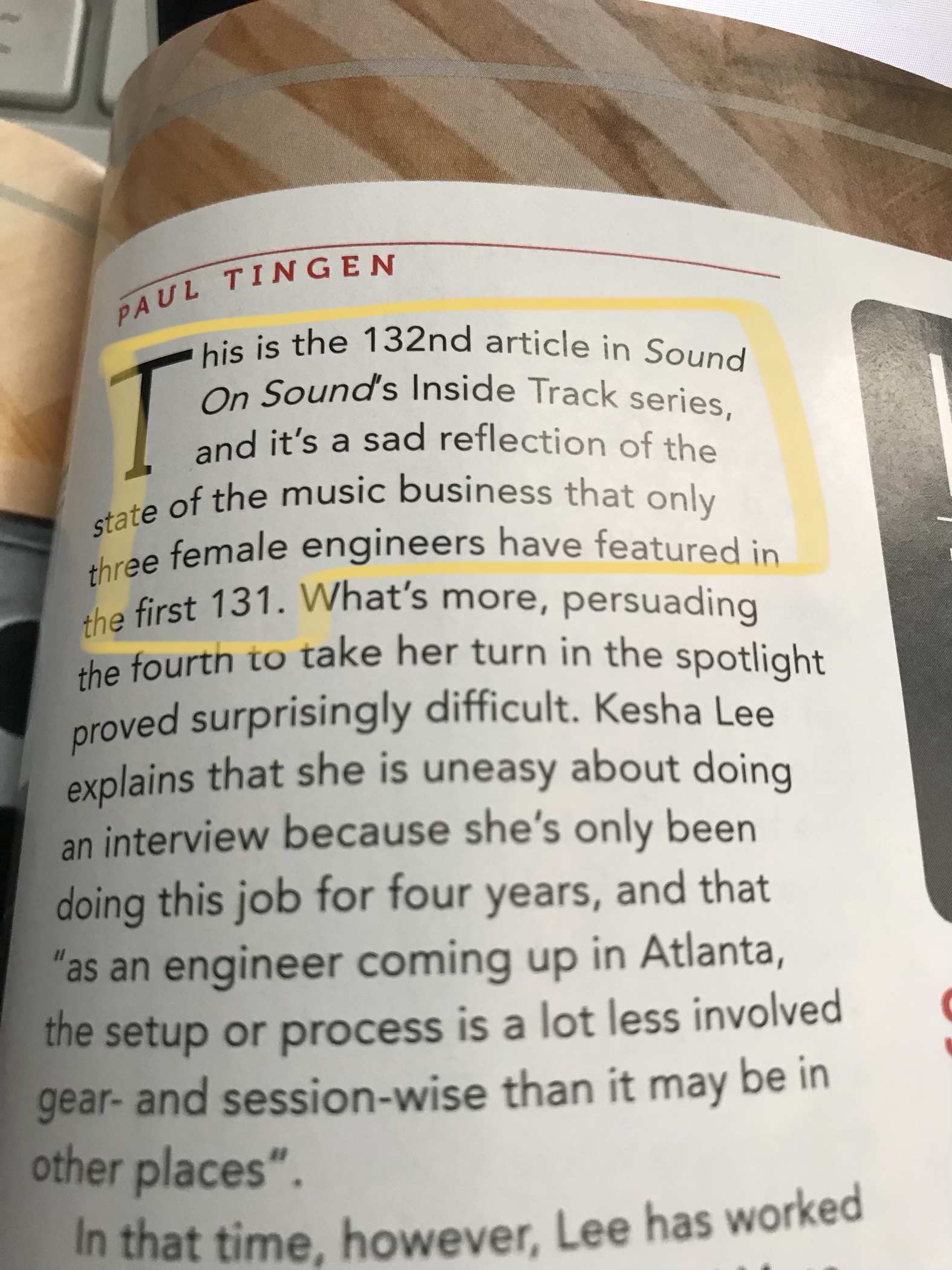 I was given a copy of the December 2017 issue of Sound on Sound at a conference last week and I was drawn to this statement in the Inside Track article about Kesha Lee “This is the 132nd article in Sound on Sound’s Inside Track series, and it’s a sad reflection of the state of the music business that only three female engineers have featured in the first 131”