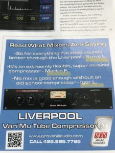 There are no female writers credited that I could see. Of the 18 ads which include pictures of people, only 1 has a woman at a mixing desk – and she’s a student with a male tutor. Of the 11 ads which include quotes, none of the quotes are attributed to a woman. Special shout out to Radial Engineering who included 8 pictures of 8 male engineers with a quote from each of them in their ad, and to Warm Audio for their tagline “like father, like son”. Way to be inclusive, fellas.