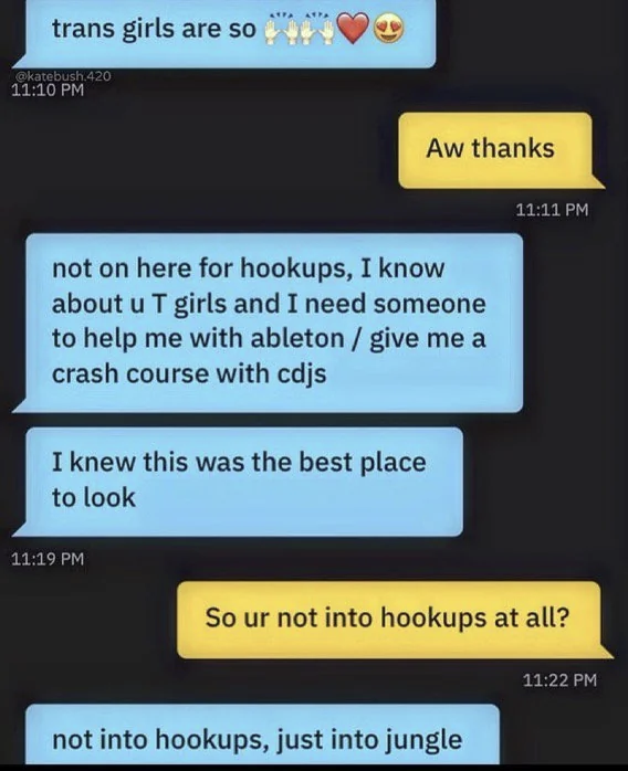 And a lot of it reminds me of literal “learn how to throw punches” self-defense. Self-defense is not about beating the shit out of people. It’s about learning how to stand your ground, it’s about protecting your face and knowing when it’s better to run. It’s about acknowledging that the world can be a dangerous place, but also that we can use the tools that patriarchy took away from us to deter aggressors just by standing in front of them with a certain posture. I see a lot of self-defense “don’t mess with me or imma mess you” in the sound choices of transfem folk. It makes sense, right? To me, it’s the sound of empowerment.
