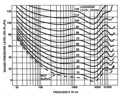 The Ear has a specific response to what we hear, meaning the higher the Sound Pressure Level (SPL) is, the flatter the response is in our ears, i.e., we tend to hear frequency range more evenly with a higher SPL. If the SPL is lower, lower frequencies are more present in our hearing