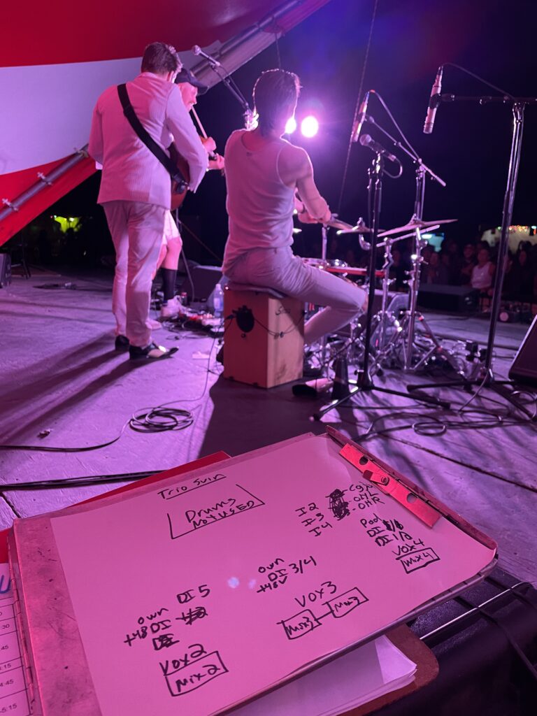 Update the stage team and FOH if anything’s changed and adjust your start scene accordingly. At festivals, a clipboard or whiteboard you can draw the stage plot, input list, and monitor mixes on can be helpful.