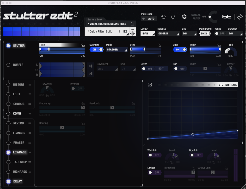 The main sonic element of the breakdown of my song is a multilayered “ah” vocal that carries throughout the section and sounds like its own synth. I did most of my design work with this sum of vocals, starting with the use of iZotope’s Stutter Edit in the intro of my song. This was my first time using this plug-in, and it was a bit intimidating when I first opened it up. I focused on manipulating the “rate” and “step” parameters under the “stutter” section to get some interesting patterns to combine with an opening low-pass filter as the intro of my song. I followed a helpful YouTube tutorial in order to get started and found a great preset to work off of called Delay Filter Build. In the picture below you can see I kept the parameters simple but found a great effect with it that ties the intro of the song to the breakdown.