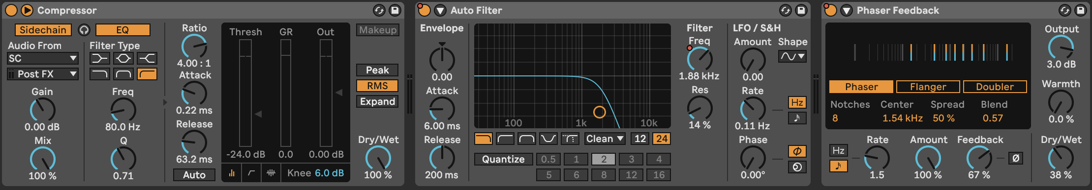 Further building on the breakdown of “This Time,” I wanted to incorporate the nostalgic feeling I get from 2010’s House music like some of Calvin Harris’s earlier hits for example. I have all the synths and background vocals side-chained to a four-on-the-floor kick to give it this floating effect. Adding the previously mentioned “ah” vocal layer into the sidechain to make it more emotive and flowy was a much faster process for me since I summed those vocals into their own stereo track when I exported out of ProTools. All I had to do to cover this technique was use the default compressor plug-in in Ableton and activate the side chain. I made a separate muted track that followed the kick pattern so I could control when the sidechain was occurring throughout the song and isolate it to that section. I set this as the key to the sidechain for the vocals and synths and adjusted the attack and release times according to to feel. Some people like to find the length of one beat in the particular tempo they are using and set attack and release times based on those calculations. I have tried this before but generally find that it doesn’t always feel the way I want it to, so I just make sure I’m using the same sidechain parameters for all my tracks to keep it clean. In the image below you can see how I use this with an auto filter and a phaser to transition the vocal layers from the last chorus into the breakdown.