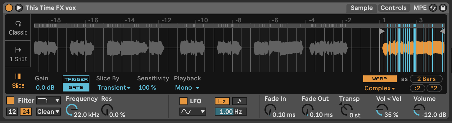 In my last blog on vocal designing, I used Simpler’s classic option to create a sampled melody from one of the lyrics in that song. For this song, I created a sampled vocal melody again with Simpler, but instead, I used the slice option for a more typical EDM-sounding sampled vocal. First, in ProTools, I took a chunk of the lead vocal and processed it with iZotope VocalSynth for autotune and formant shifting effects. I used this processed vocal in the breakdown as is, and I also added it to a MIDI track with Simpler on to create a new melody. With the slice option, I could map out the different notes of the existing melody, so I could control the rhythm and choppiness of those notes. I preferred this method far more than just using the one-shot method in my last song because I actually made a unique melody with it that diverged from the song’s original melody. This technique was also really intuitive to navigate and utilize and (honestly) made me feel like a real producer for maybe the first time…