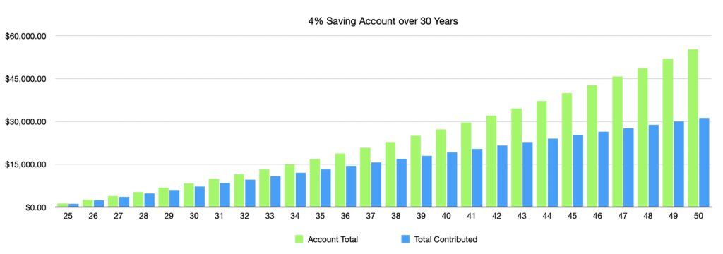 Let’s look at an example savings account. A high-yield one might pay 4% interest per year: