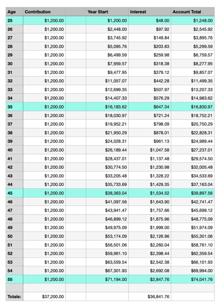 At 25 years old, you put in $100 a month. At 55 years old, you would have put in $37,000 ($1,200 per year for 30 years), but the account balance would actually be $74,000. It’s double what you put in it, but where did the other $37,000 come from?