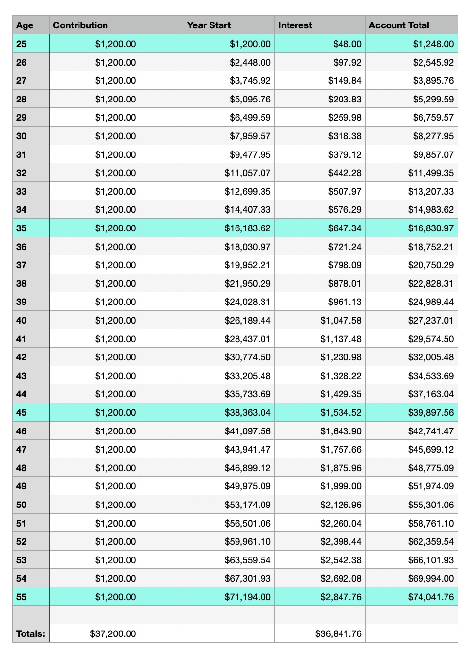 At 45 you’ve put in $25,000 and the account would be almost $40,000.