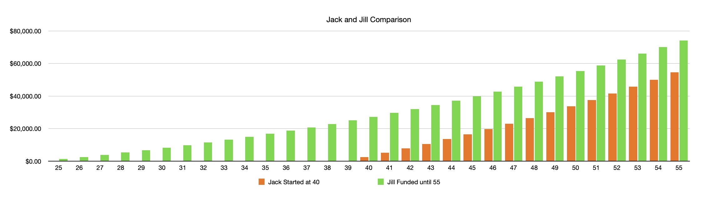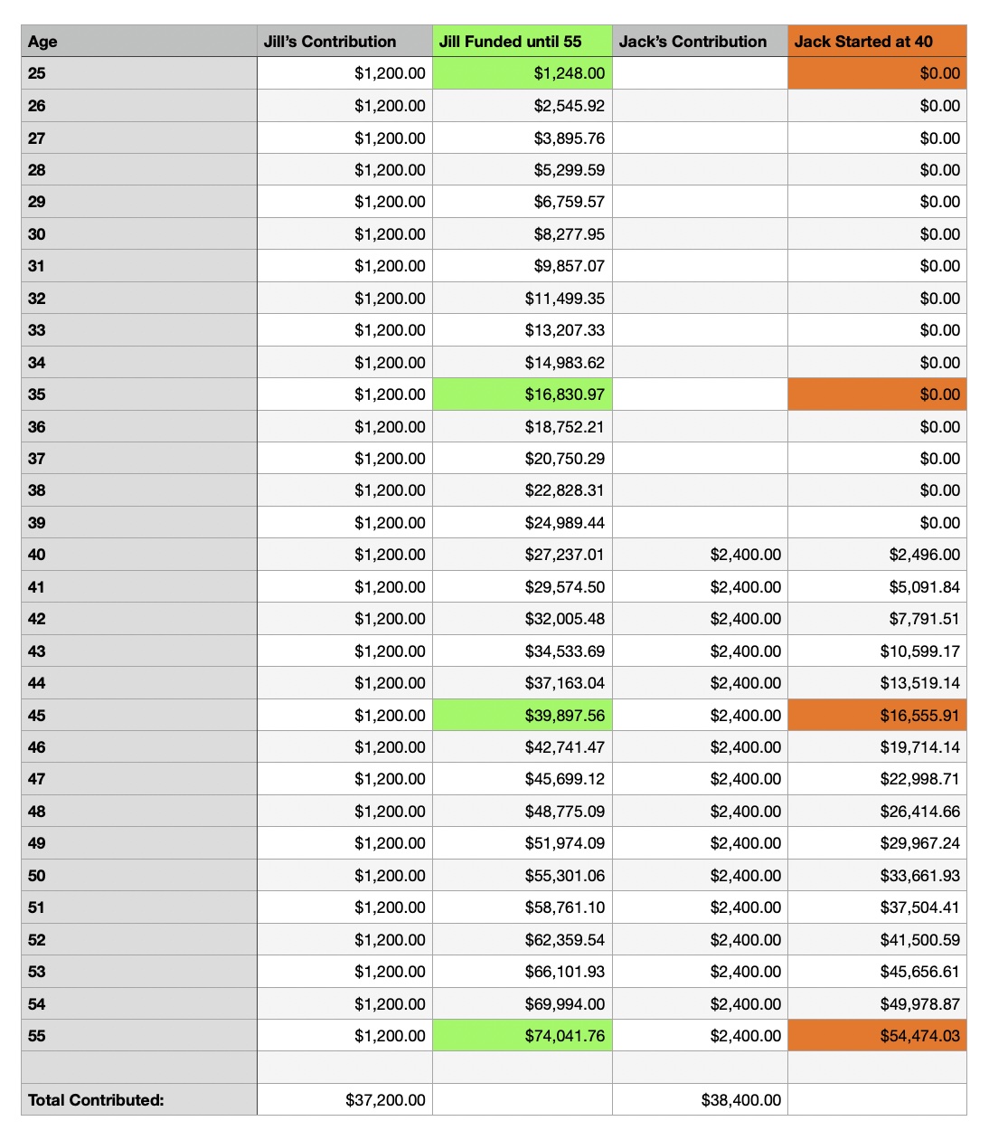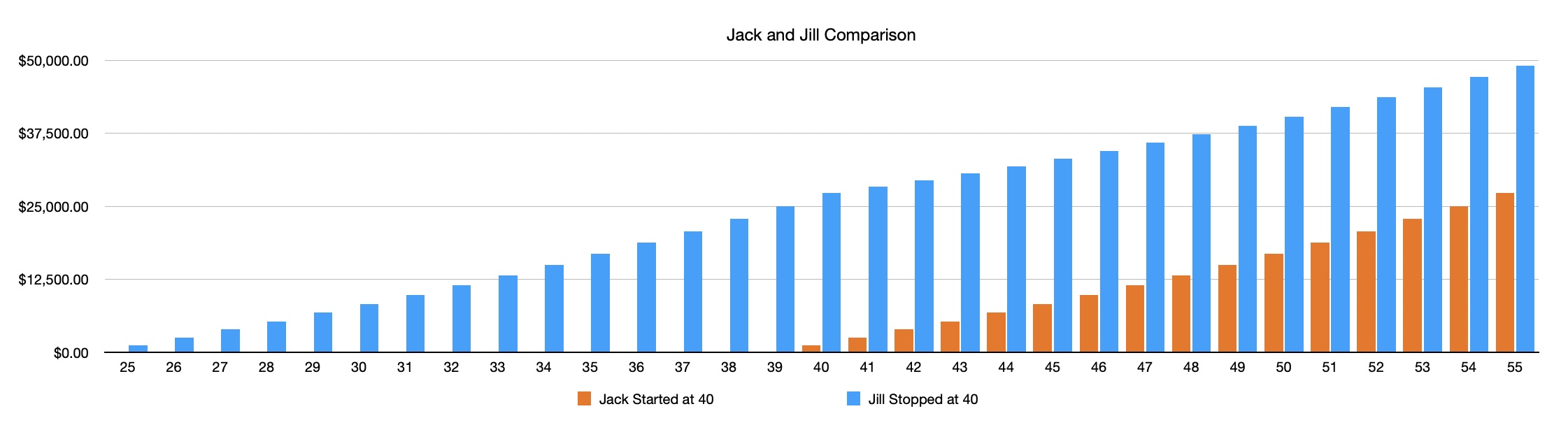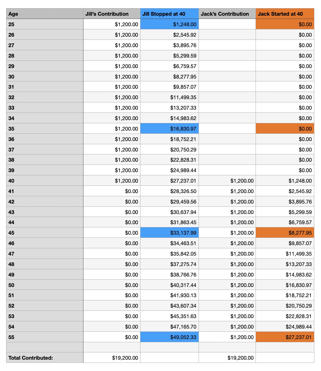 Both contributed the same amount: $19,200. But when they’re both 55 Jill’s account is almost $50,000, while Jack’s is only $27,000. Those extra 15 years of interest make a $23,000 difference for Jill.
