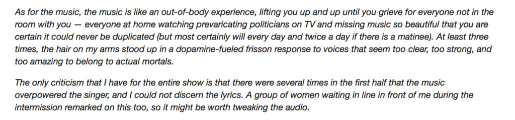 Credit is usually given to the actors. Criticism is usually given to the crew. The sounds they heard that were indeed too clear and strong to come from a mere mortal since it was in reality coming from a sound system that created both the “out of body experience” and the times they had trouble with the lyrics.