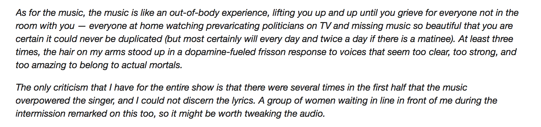 When I was on Saigon, I had one man stand by FOH and tell me that the show sounded bad and just kept repeating that until I had exhausted my usual polite responses, hit the end of my patience, and finally told him he was being rude. To which he responded “I’m not rude, I’m telling you it’s bad” and huffed off.