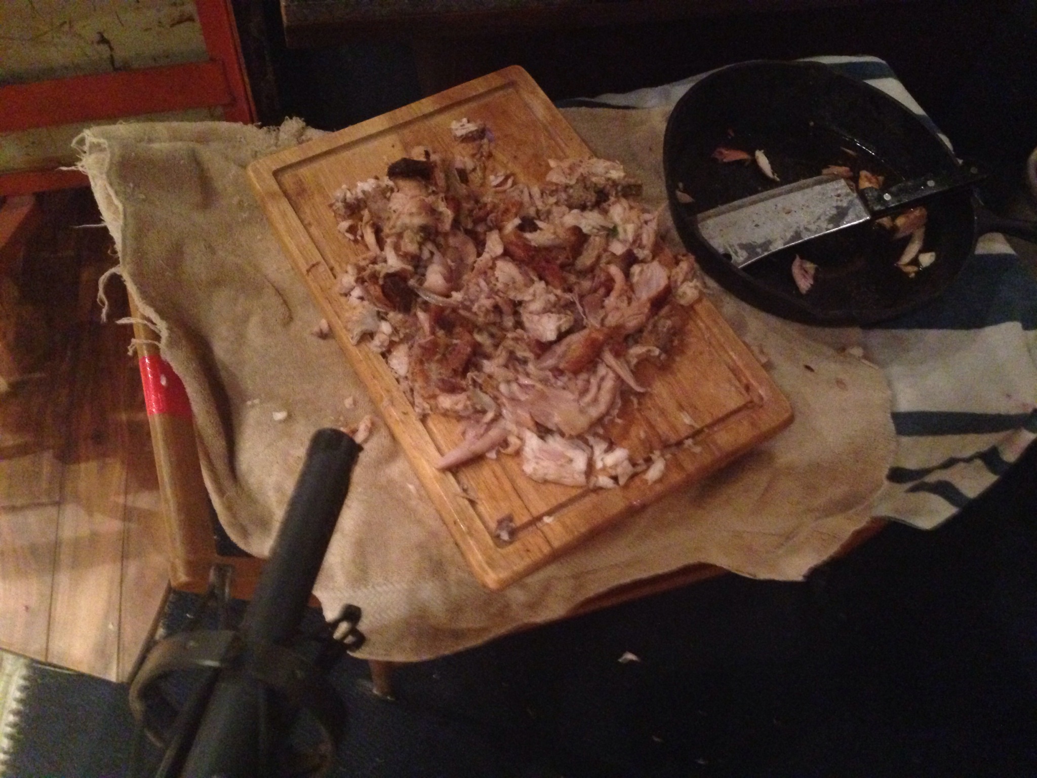 Wet chamois is your best friend when it comes to dripping blood and gore kinds of noises, and in the Rosemary’s Baby remake for television, I used a grilled chicken to make the hacking sounds for a particular flashback scene where the ancient witches that are haunting the building are seen hacking a body to pieces in a human sacrifice ritual.