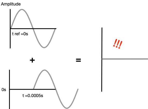 That means the period of a 100Hz wave is ten times longer than the period of a 1,000Hz wave! A time offset between two copies of the same frequency wave at equal amplitude will have phase offsets dependent on their frequency because of their different periods. For example, the 0.5ms offset between two 1,000 Hz waveforms results in a 180 degree offset, but if we do the math for the same offset in time between two 100Hz waves,