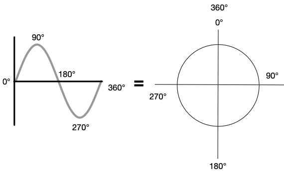In order to really understand what we are talking about when we are talking about phase, we are going to dive even further back into our basic understanding of sound. Not just sound, but how we represent a wave in mathematical form. Recall that sound, in and of itself, is the oscillation of molecules (typically) air traveling through a medium and for us humans we perceive the oscillations moving the organs in our ears at rates between 20Hz to 20,000Hz (if we are lucky). We represent the patterns of this movement in mathematical form as sine waves at different frequencies (remember what Fourier said earlier about complex waveforms?). Because of the cyclical nature of these waves, i.e. the wave repeats itself after a given period, one period of the wave can be thought of as a circle unwound across a graph.