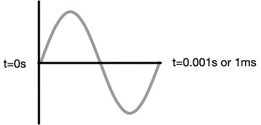 The period of a 1,000Hz sine wave is 0.001s or 1 millisecond (1ms). We can visualize this as the amount of time it takes to complete one full cycle and travel from 0 to 360 degrees around the 1,000Hz circle as 1ms or 0.001s.