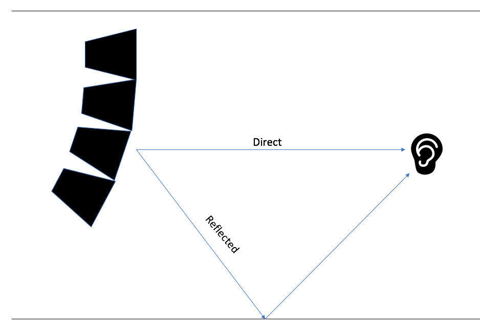 Our ears are like little microphones that send aural information to our brain. Our ears vary from person to person in size, shape, and the distance between them. This gives everyone their own unique time and level offsets based on the geometry between their ears which create our own individual head-related transfer functions (HRTF). Our brain combines the data of the direct and reflected signals to discern where the sound is coming from. The time offsets between a reflected signal and the direct arrival determine whether our brain will perceive the signals as coming from one source or two distinct sources. This is known as the precedence effect or Haas effect. Sound System Engineering by Don Davis, Eugene Patronis, Jr., & Pat Brown (2013), notes that our brain integrates early reflections arriving within “35-50 ms” from the direct arrival as a single source. Once again, we must remember that this is an approximate value for time since actual timing will be frequency-dependent. Late reflections that arrive later than 50ms do not get integrated with the direct arrival and instead are perceived as two separate sources [5]. When two signals have a large enough time offset between them, we start to perceive the two separate sources as echoes. Specular reflections can be particularly obnoxious because they arrive at our ears either with an increased level or angle of incidence such that they can interfere with our perception of localized sources.