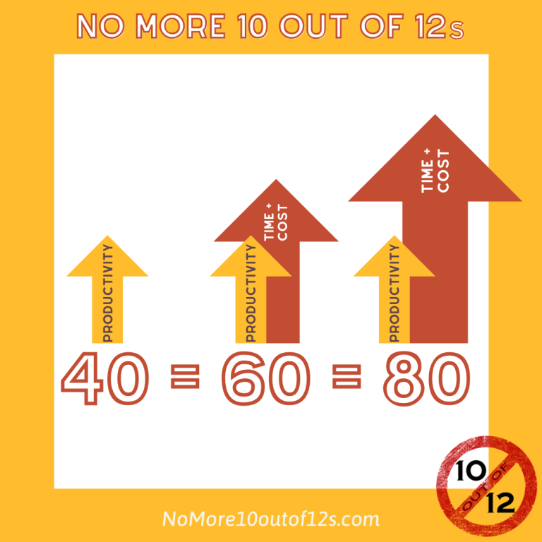 Business Roundtable Studies suggest that there is a ceiling for productivity that exists around 40 hours a week. This means that working for 60, or even 80 hours in a week still only yields about 40 hours of productivity. Therefore, theatre companies that schedule 10/12s are, in essence, paying more money in the form of overtime for the same amount of work and no real gain.