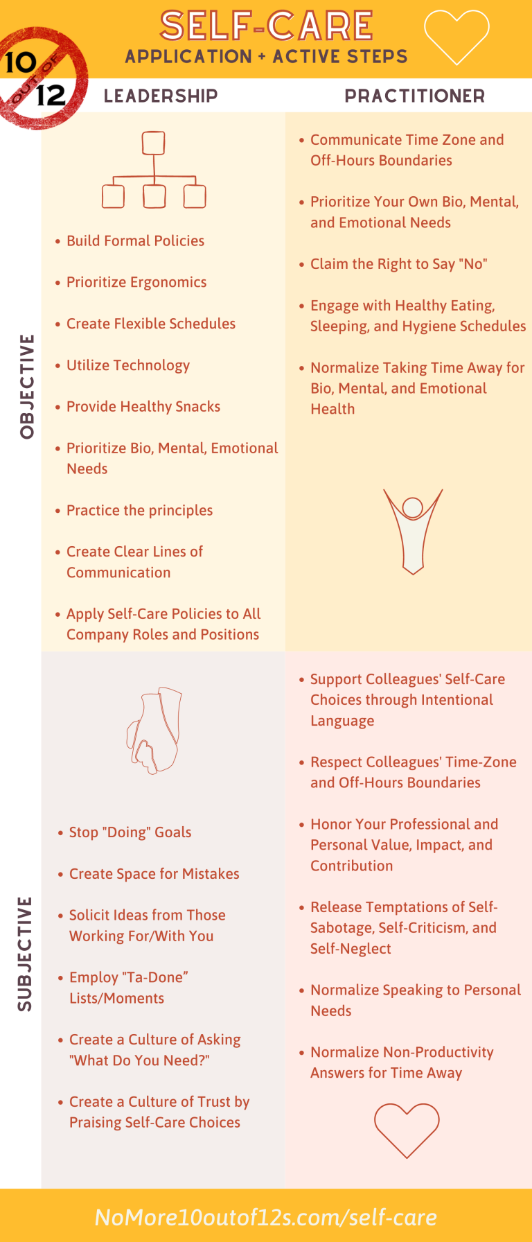 Based on the reasons that I have already outlined, it is easy to see the ways in which the 10/12 perpetuates racism, ableism, and our industry’s existing stigma against caregivers, to name just a few of its crimes. No More 10 out of 12s has held multiple online seminars diving into why 10/12s specifically harm the BIPOC community, parents (and other caregivers such as those with aging parents at home), the disability community, lower-income folks, and others. These talks can be viewed at nomore10outof12s.com/events.