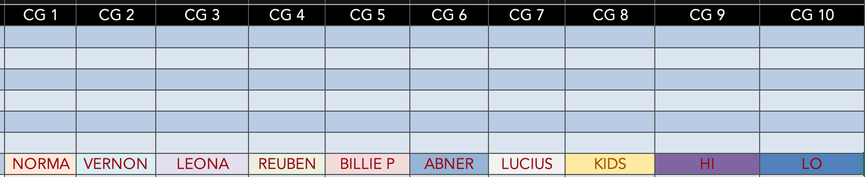 You will notice from the color coding that I have changed as few VCAs as I need to in each scene to make the programming work. So, even if REUBEN isn’t in a scene/song, I didn’t bother clearing him out unless I needed VCA 4 for something else