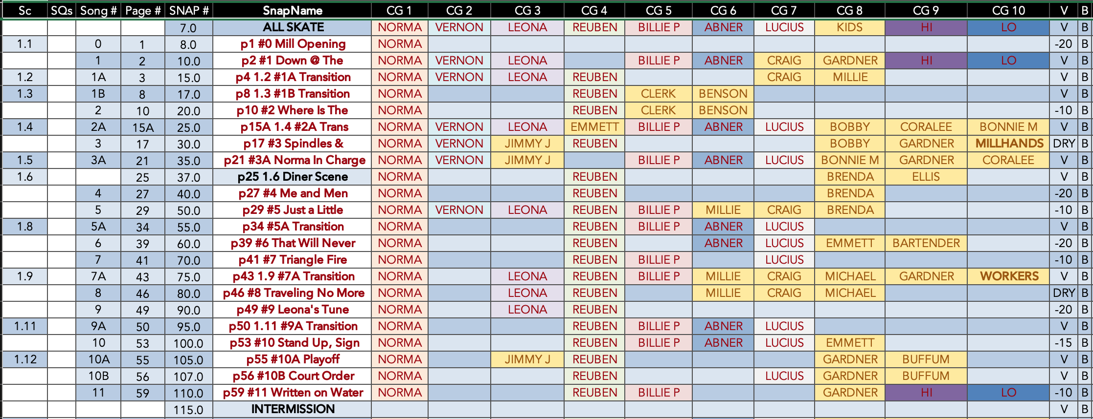 Once you’ve got your all-skate scene written, build every subsequent scene out of that template and only change what you need. On a standard musical you might eliminate characters who don’t speak from your VCAs; don’t bother with that here. The likelihood of things changing and people getting added is so high that you might as well be prepared. So, to return to our example from above, here is what my programming for the whole show of Norma Rae wound up looking like.