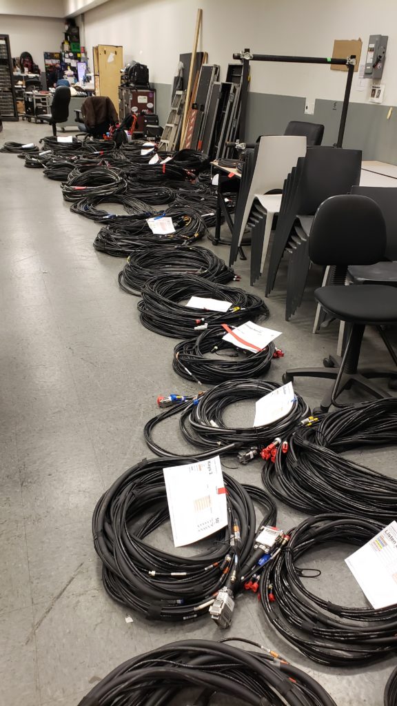 A new-ish development in post-pandemic shop work is that show build crews are often doing the actual bundling of cables themselves. Some shows may pay to have the shops do the bundling for them, but this has not been the norm in 2022 in my personal experience. The act of bundling is done by flagging all the ends that begin at one origin (such as ampland) with colored gaff tape, then wrapping friction tape around the entire “girth” of the cable bundle every 3-ish feet, so that all the cables in the bundle can then be easily coiled up and run out together as though they were one very thick cable. It’s gonna feel like major “arm day” by the time you’re done, so prepare yourself. I personally recommend wearing long sleeves and gloves for when you’re laying out 250’ of cable and inevitably getting various dirt and schmutz all over yourself!