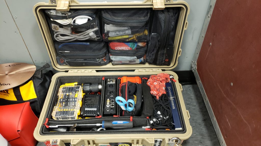 Most of what you need can be provided either by the production or by your fellow shop hands, so definitely don’t feel like you have to go spend all your money on nice tools before you’ve even gotten your first shop paycheck! That said, once you do a few builds you may find it nice to have your own tools for certain tasks. A great way to carry them is in a Pelican case, and you will see many sound folks bringing theirs into the zone on the first day of a build. But do whatever works for you and your budget. Perishables such as tape, tie line, and zip ties will be purchased by the production; there is no need to bring your own.