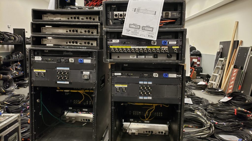 In most cases, the ends of a bundle will find themselves getting plugged into racks. Racks of gear will be designed on a per-show basis by the designer and associate designer and be articulated in a series of rack drawings. These can be made in software such as Vectorworks, Excel, OmniGraffle, or sometimes just sketched out by hand in a pinch.