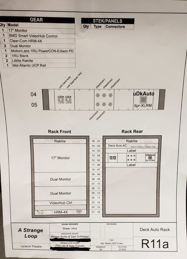 “L: the rack drawing for the Deck Automation rack for the Broadway production of “A Strange Loop”. C&R: the finished rack viewed from front and rear! Rack drawing by Sam Schloegel.”