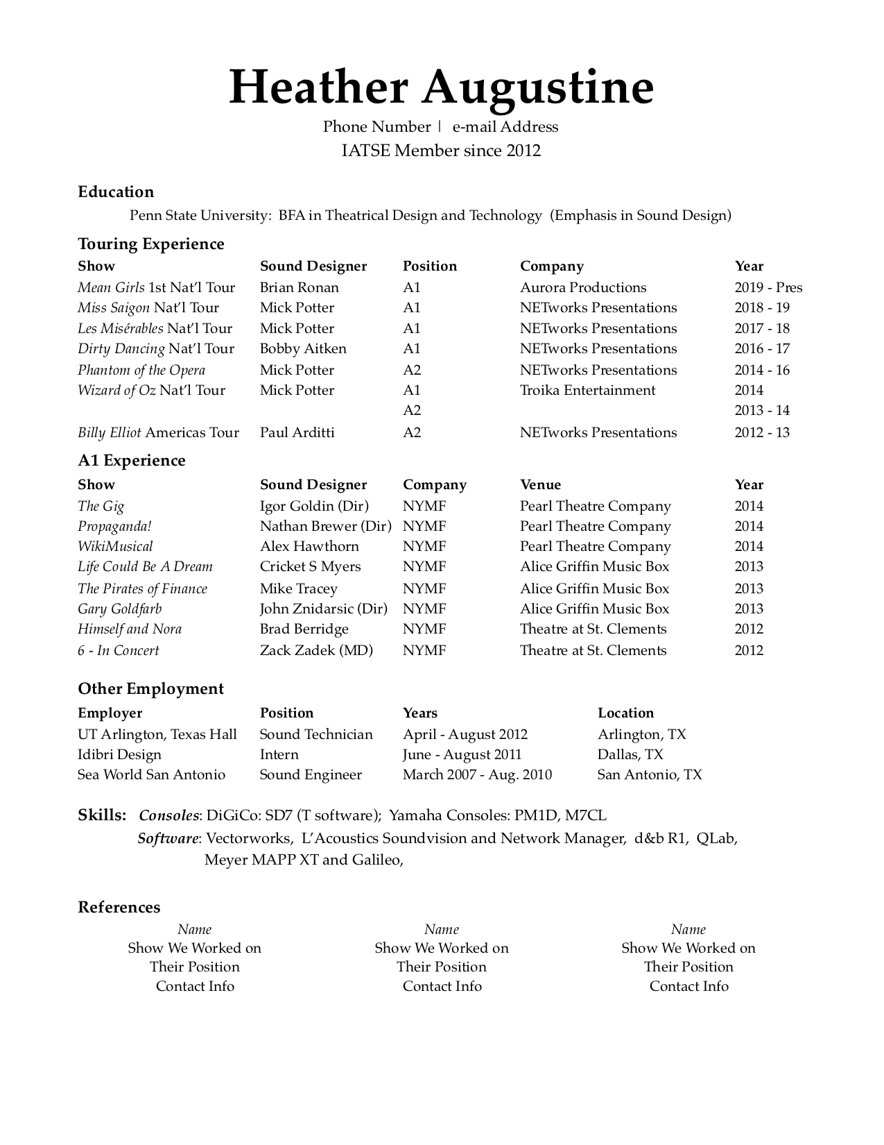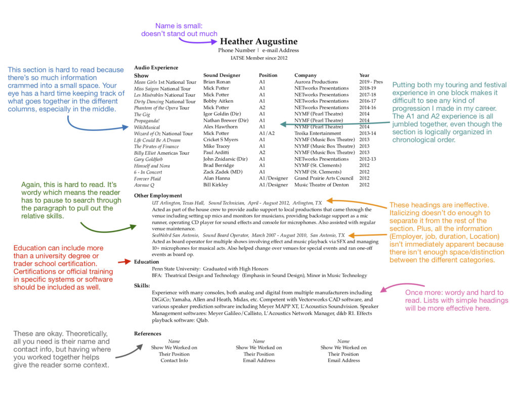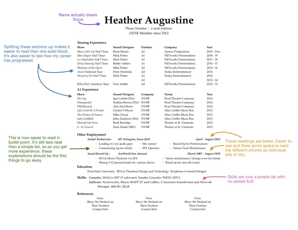 - Where are you coming from? Your resume will look different depending on where you are in your career. My jobs on tour don’t need explanation other than if I was the A1 or A2 because most people reading my resume are familiar with the job responsibilities of those roles. However, if you worked at a theatre where your official title was “Audio Supervisor,” but your job included designing, mixing, A2-ing, etc, it’s helpful to include that. Giving additional information on a job can be helpful if you’re at the beginning of your career and have less experience to put on your resume. Be clear and concise (i.e. lean towards bullet points vs sentences) and make these things the first to go as you work more and can streamline your resume.