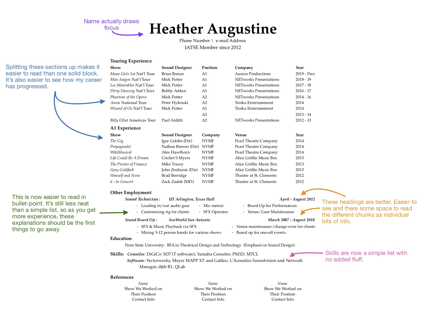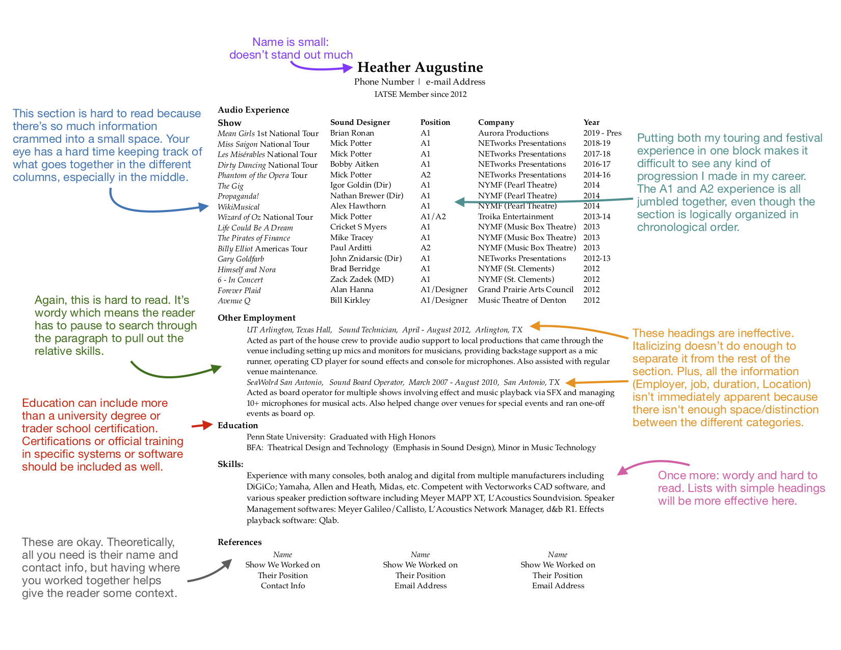 For example, when I left college, I broke my experience in a few categories: Touring, A1, A2, Corporate, and Other Experience. It was busier than it needed to be and didn’t have much organization other than dividing up my experience. After working for a few years, my resume shifted to two categories: Touring and A1. That simplified things by getting rid of my college experience, starting to use sound designers instead of directors for shows, and formulating a better narrative. Instead of throwing every show, I’d done in the mix, I used my touring experience to highlight my progression from an A2 to A1, and selected certain shows I’d mixed off of tour to show that I’d worked at the same festival multiple years in a row (i.e. people wanted to work with me again).